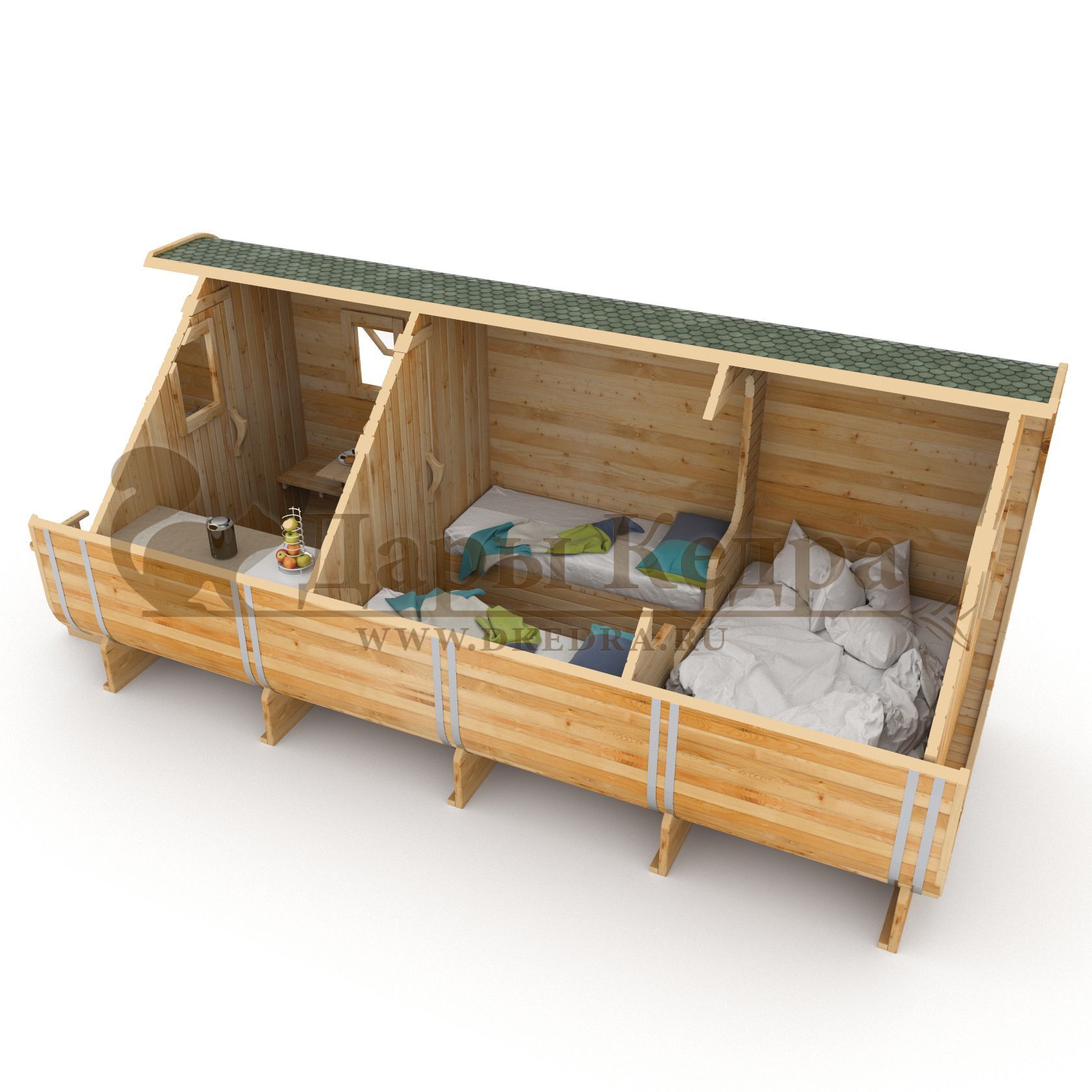 19. Кемпинг дом «Квадро» с боковым входом Такой кемпинг дом удобное и практичное решение для дачного использования или обустройства загородных баз отдыха. Увеличенные размеры и боковой вход со стеклянной дверью позволяют зонировать внутреннее пространство помещения. Домик включает в себя: Прихожую, совмещенную с кухней. Здесь находится стол, полочки и вешалка для одежды. Спальная комната с двумя односпальными кроватями. Спальная комната с одной полутора спальной кроватью. По вашему желанию любую из комнат можно укомплектовать душевой зоной с санузлом. Кемпинг дом изготовлен из хвойных пород древесины. Кровля из мягкой черепицы обеспечивают защиту от осадков.