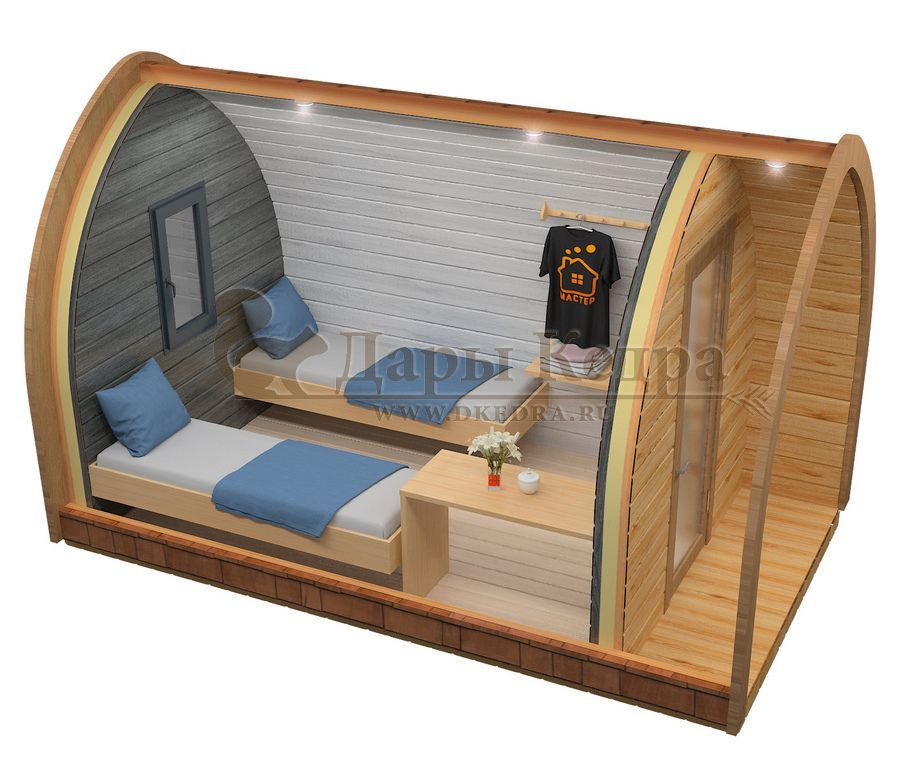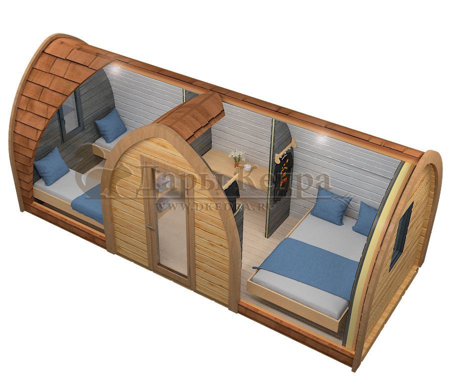 1. Кемпинг дом «Викинг» Экологичный утепленный дом 'Викинг' подходит для постоянного проживания на даче или для обустройства загородных баз отдыха. Оригинальная модель включает два помещения и позволяет рационально использовать внутреннее пространство. Кемпинг-дом предполагает два варианта размещения: Прихожая и комната со спальным местом; Комната со спальным местом и сауна с парилкой. Утепленный пол с покрытием (ламинат), пароизоляция под кровлей, панорамные окна, современная сантехника сделают пребывание на природе комфортным и безопасным круглый год.