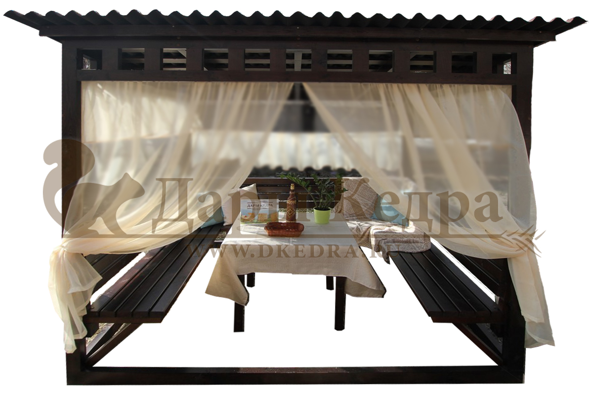 Беседка из дерева Беседка выполнена из кедра. На крыше - ондулин. Конструкция отличается простотой в установке, легкостью, долговечностью, прочностью и классическим дизайном, который впишется в любой интерьер приусадебного участка. Вокруг неё можно организовать ландшафт из вьющихся растений, которые красиво создадут зеленые 'стены' снаружи и уют внутри.