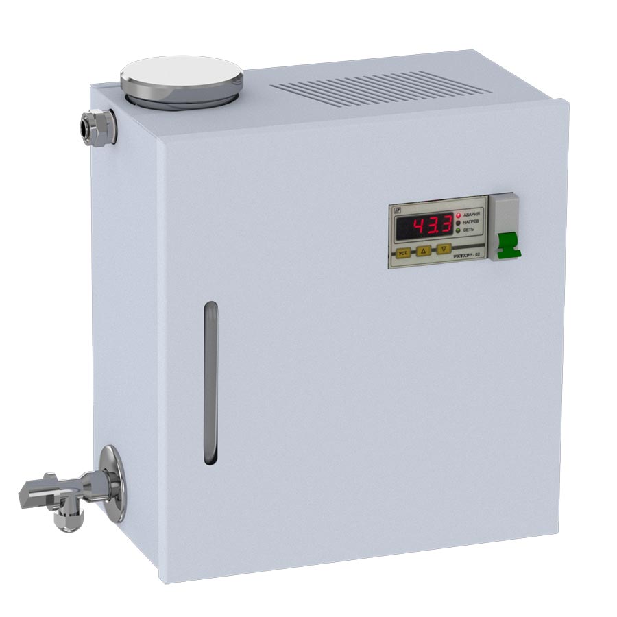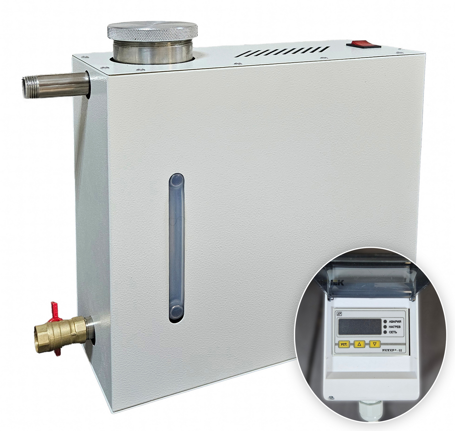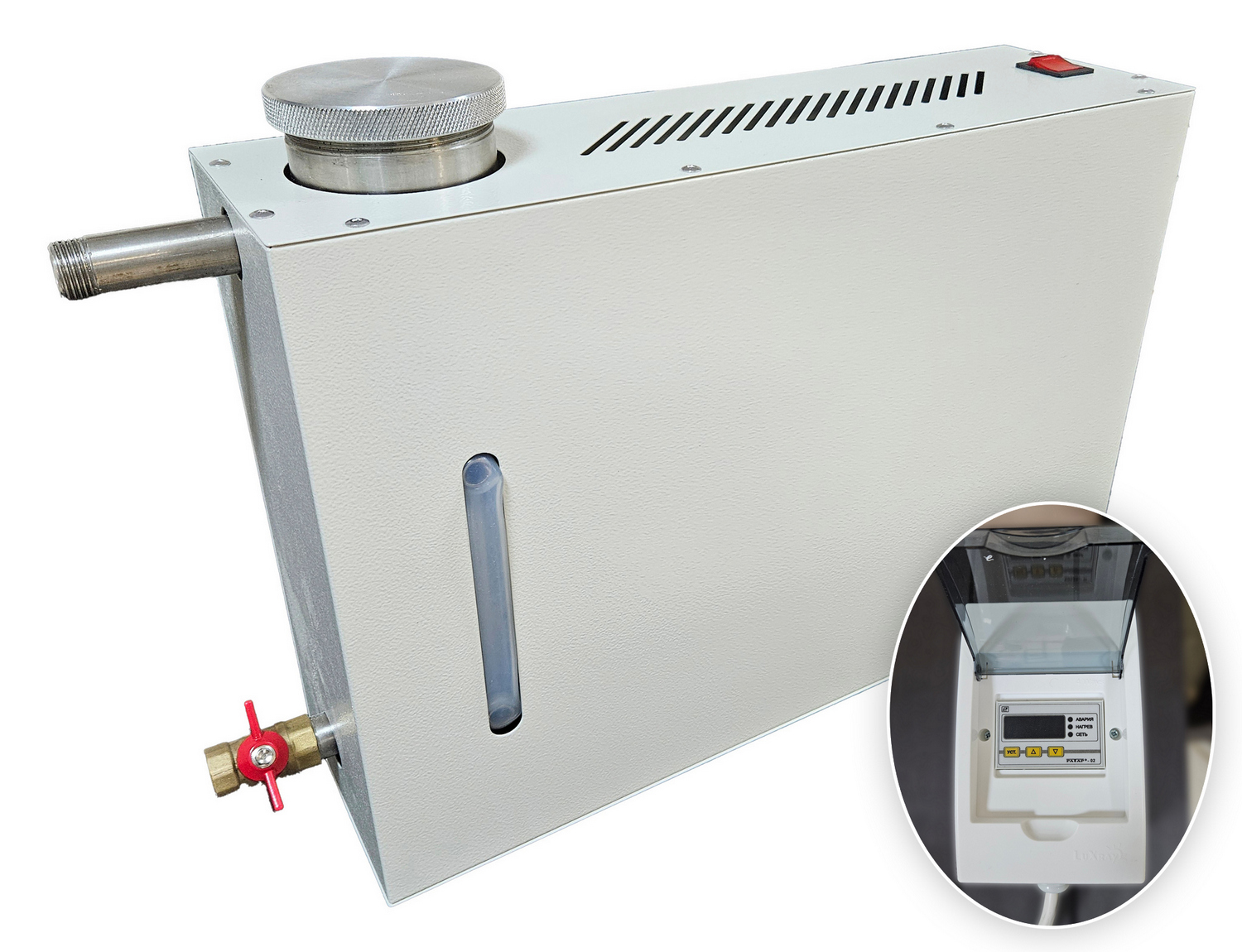 Парогенератор накопительный с цифровым блоком управления и таймером, 2,5 кВт Прибор служит для создания пара путем закипания воды. В металлическом корпусе парогенератора находится бак для воды со съемной аромаемкостью в виде сеточки. Рядом располагается индикатор в виде трубки, благодаря которому осуществляется визуальный контроль за уровнем воды. Парогенератор накопительного типа работает от электричества и не требует подключения к водопроводу. Вода в него добавляется самостоятельно. Для удобства пользования парогенератор имеет выносной пульт управления, который позволяет установить температуру, мощность и время процедур парения. При превышении заданной температуры и низком уровне воды устройство отключается автоматически. Звуковой сигнал таймера дополнительно сообщает об этом. Целебный пар поступает в фитобочку по паропроводу и насыщает организм человека полезными веществами.