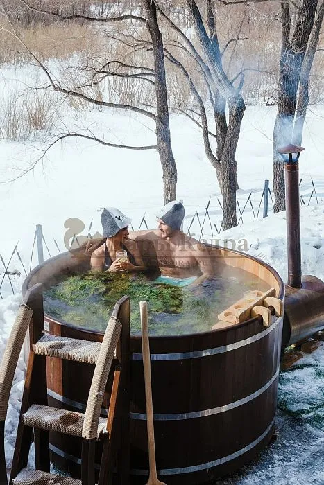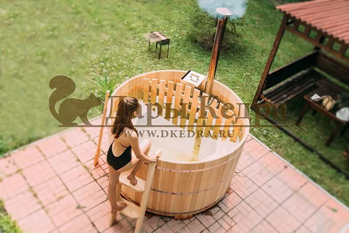 У стальной ёмкости расположение печи предполагается только под самой чашей, обеспечивая равномерный прогрев. Если нет возможности сразу купить конструкцию с печкой, то можно под чашей разводить костер, согревать воду таким, более дешевым путем. В уличной купели вариант размещения источника тепла может быть только снаружи или внутри. А значит, конструкция без печи работать полноценно не будет. - Обшивка сидений и подспинников банной чаши внутри выполняется из кедра или лиственницы. Купель изначально выполнена из дерева, поэтому все ее комплектующие в стандартной комплектации тоже деревянные. Внутри японской бани можно установить пластиковую вставку, тогда по аналогии с чаном сиденья будут обшиты деревом.