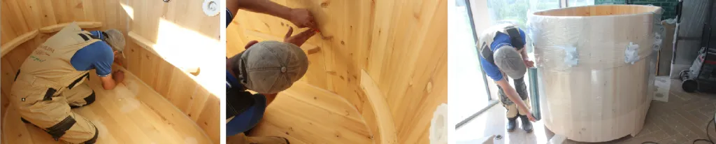 Купели из кедра могут быть разных форм и размеров: круглые, овальные, угловые, прямоугольные и квадратные. Каждая форма и размер предполагает свою схему сборки. Изделие доставляется в собранном виде, стянутая обручами. Перед началом сборки необходимо разобрать купель, занести по частям в помещение, где будет в дальнейшем она установлена, а далее осуществить сборку по месту.
