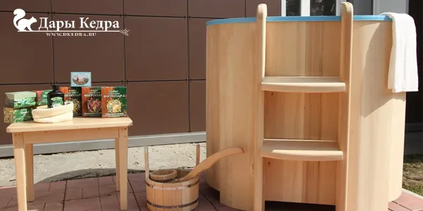 Кедр — влагостойкий материал с приятным хвойным ароматом, мало усыхает. Природный антисептик, насыщает воду и воздух вокруг фитонцидами, благотворно влияющими на здоровье.